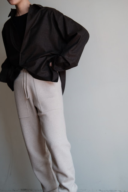 空気をたっぷりと含んだベビーカシミヤの極細糸を8ゲージ3本どりで度目を詰めて丁寧に編み立てたフーディー・クルーネック・ジョグパンツ。