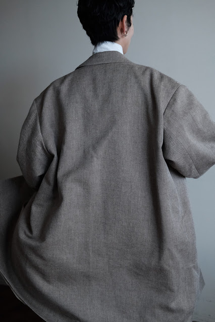 ポケットワークやVゾーンの余白、ラペルの形状にも独自のセンスが光るオーバーシルエットのMid Coat & Jacket。